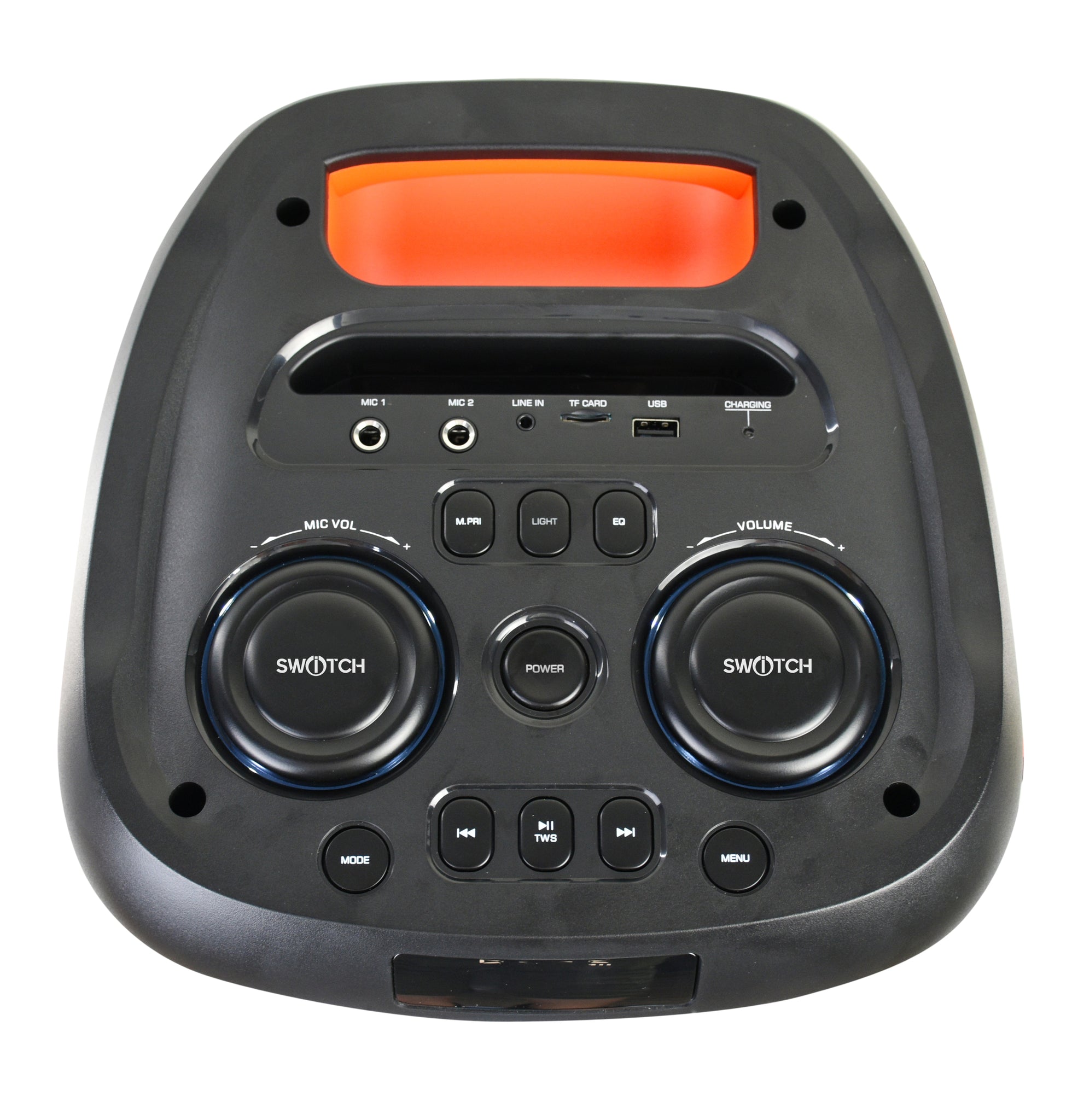 SWITCH DOUBLE 6.5" PORTABLE TWS SPEAKER ● Double 6.5" speaker ● 1" Tweeter ● 7.4V/3600mAh Battery ● 40W RMS ● 2500PMPO ● True Wireless Stereo ●Bluetooth 5.0 ● LED Lights ●Auxiliary In/USB/TF Card/Guitar Input ●Bass/Treble/Microphone Volume/Echo Control ●Microphone Priority ●Recording ● one wireless microhpne inclusions: charger, user manual, Remote control, Wireless Microphone